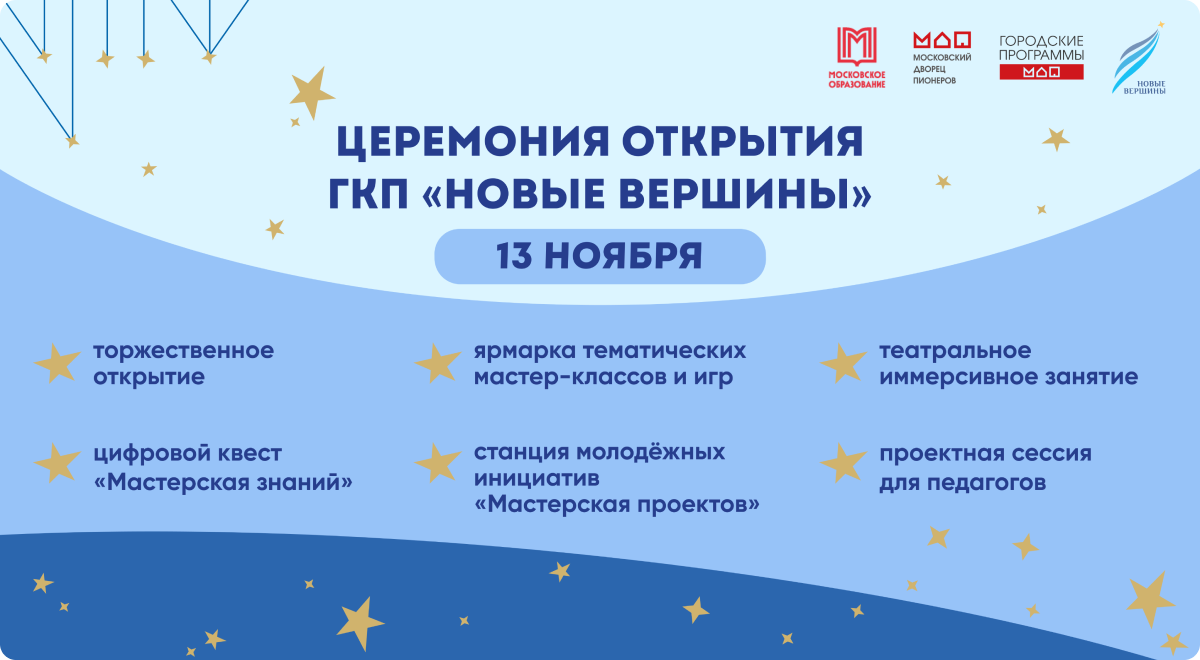 13 ноября в Московском дворце пионеров пройдет церемония открытия городской конкурсной программы «Новые вершины». В этом учебном году Программа отпразднует юбилей, свое десятилетие! В день мероприятия будет работать множество площадок, посвященных юбилейному десятому сезону. Каждому участнику будет вручен маршрутный лист с картой мероприятия. При посещении пяти и более площадок участники получат гарантированный сувенир от Новых Вершин! Дополнительная информация: почта nv@mailvg.ru или телефон 8 (495) 536 00 00 (доб. 2263) | |